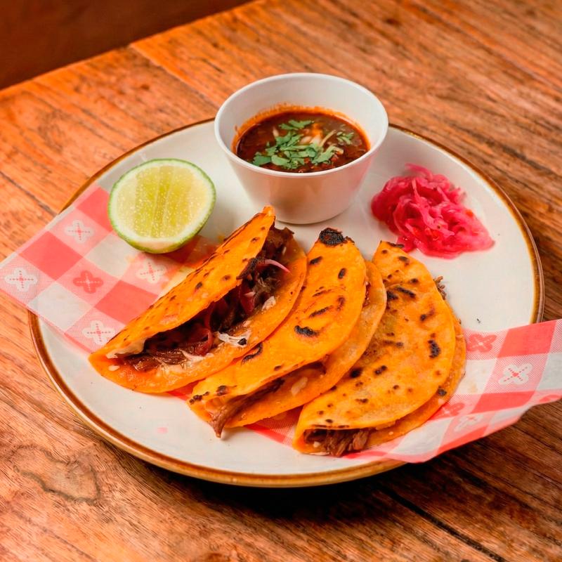 Shredded beef cooked in guajillo chili sauce with melted cheese, and served with consommé on the side (beef broth). 3 Tacos per order.